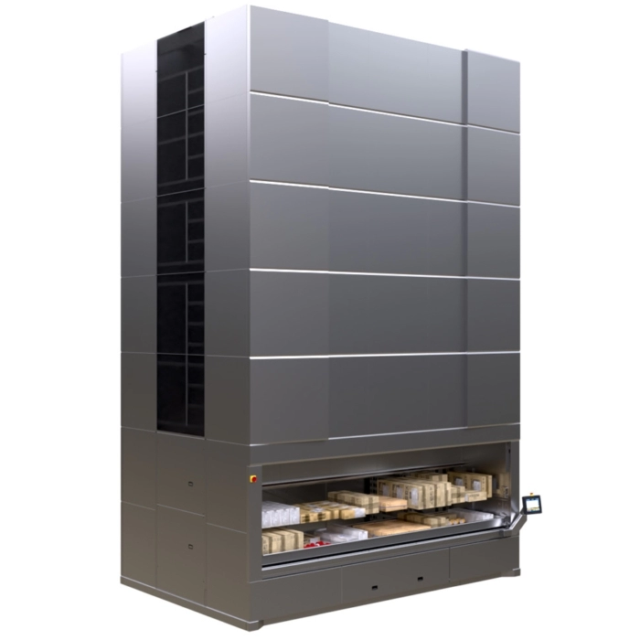 - Inventory is stored on adjustable trays within a tall, enclosed structure.